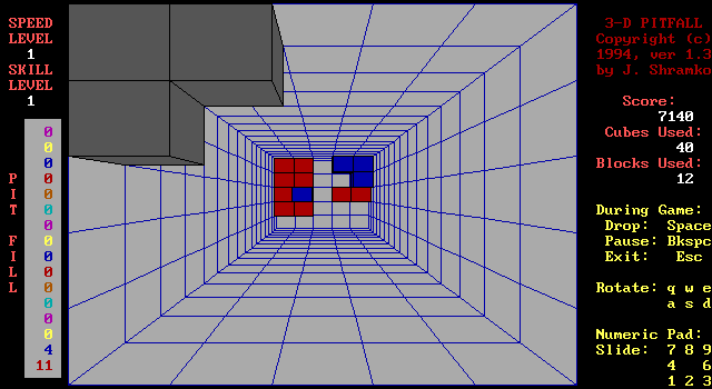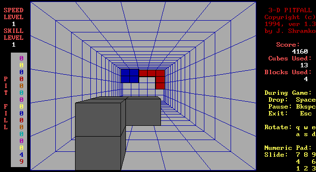 3-D Pitfall John Shramko, 1995 Play now Bookmark Download 3-D Pitfall offers a little extra compared to other classic tetris styled games by adding the 3D perspective. Category: Tetris License: Freeware Rating: rate now Language: English Share this game Facebook Twitter Reddit Game controls - Left - Right - Up - DownQWE - RotateASD - RotateSpace - DropBackspace - PauseEsc - Exit Rating & comments No ratings yet Rate now
