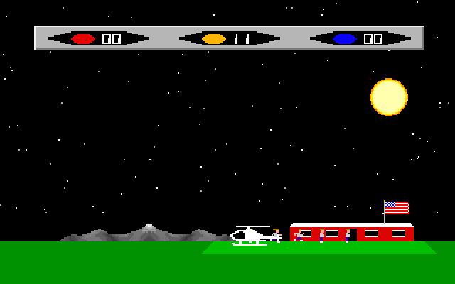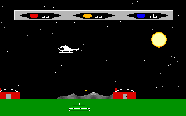 You are the pilot of a rescue helicopter. Your mission is to fly to a mideastern terrorist compound and rescue 64 hostages that are being held in four seperate buildings (16 in each building) and fly them back to the American embassy. The terrorists have a seemingly endless supply of tanks, jet fighters and chopper-seeking drones to hender your success. Your helicopter will hold only 16 hostages, so a minimum of 4 missions must be flown to rescue all of the hostages. The door of the first building has already been blown open and the hostages will be outside waiting for you. You must blast open the remaining buildings (or get the tanks and jets to do it) to free the remaining hostages. The buildings must be opened in order (right to left). Whenever you land, the hostages will come running and enter the helicopter. Once you have a full load onboard (16), fly them back to the embassy and land on the light green landing pad to the left of the building. The hostages will exit the helicopter and enter the embassy.