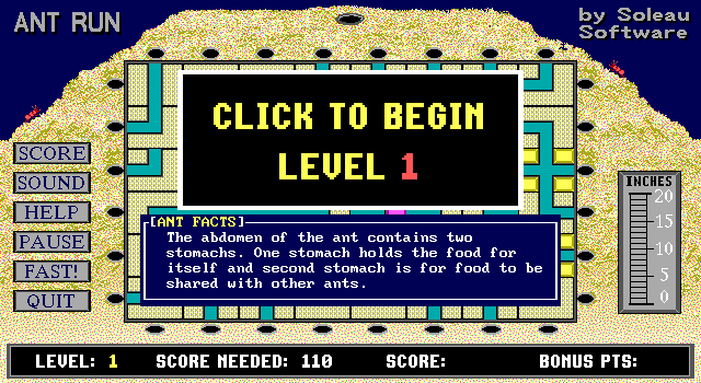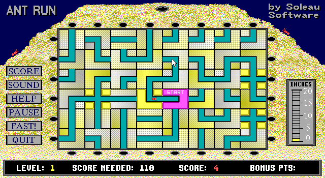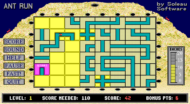 Ant Run Soleau Software, 1993 Play now Bookmark Download Ant Run is a Shareware Puzzle game published by Soleau Software in 1993. Category: Puzzle License: Shareware Rating: rate now Language: English Readme files: ANTRUN.DOC Share this game Facebook Twitter Reddit Game controls Use your mouse to play Ant Run. Rating & comments No ratings yet Rate now