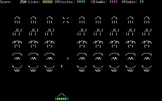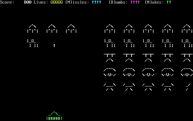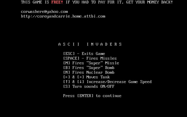 ASCII Invaders Corey Mercer, 2002 Play now Bookmark Download ASCII Invaders is a Freeware Action game published by Corey Mercer in 2002. Category: Action License: Freeware Rating: rate now Language: English Readme files: README.TXT Share this game Facebook Twitter Reddit Game controls - Move left - Move right - Increase - DecreaseSpace - Fire missileM - Fire super missileB - Fire super bombN - Fire nuclear bombEsc - Exit Rating & comments No ratings yet Rate now