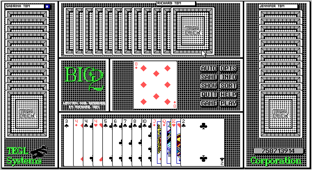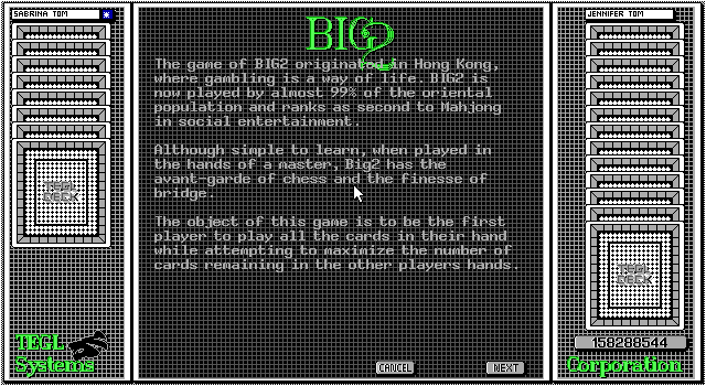 The game of BIG2 originated in Hong Kong, where gambling is a way of life. BIG2 is now played by almost 99% of the oriental population and ranks as second to Mahjong in social entertainment. Although simple to learn, when played in the hands of a master, Big2 has the avant-garde of chess and the finesse of bridge. The object of this game is to be the first player to play all the cards in their hand while attempting to maximize the number of cards remaining in the other players hands.