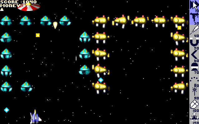 You control the ship at the bottom of the screen, use keyboard or joystick to move left and right. Shoot the aliens and then catch the coins to earn money. There is a variety of aliens, weaker on early levels, stronger on later levels. There are silver coins and golden coins. Golden coins are worth the same as 2 silver coins.