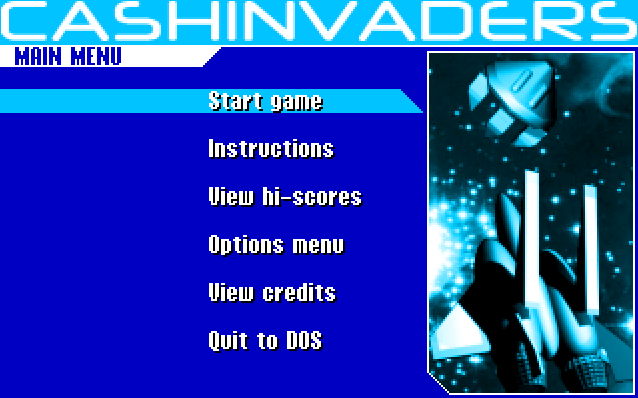 Cash Invaders is a shoot’em up for MS-DOS based on Space Invaders. It has 100 levels, 9 bonus levels, raytraced graphics and power-ups.