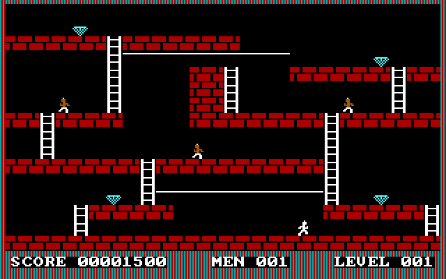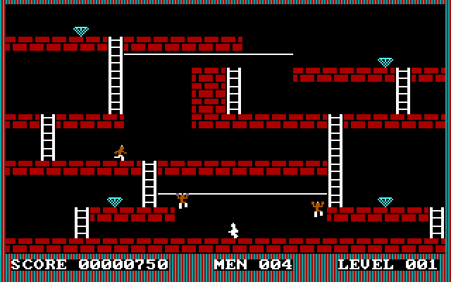 You are a highly trained commando sent by the Farturion Empire to reclaim a stolen cache of Farturion Diamonds. They were stolen by a group of Raven Warriors from the dark world Yranus. The diamonds are being held in an underground warehouse deep beneath the vile surface of Yranus. The warehouse has 25 levels. You must pick up all the diamonds in each level to progress to the next level. Each level will be heavily guarded. The guards have no weapons, but since they are such vile creatures, if one of them touches you, you’re history. Your only weapon is a portable proton accelerator that allows you to blast large holes in the floor which the guards (and you) can fall into. The holes will “heal” after a certain amount of time. If a guard is in a hole when it heals, he will reappear at the top of the screen. If you are in a hole when it heals, you’re dead. You have 5 lives at the beginning of the game. You gain 1 life for each level you complete. When all lives are used up, the game exits to DOS. Remember that the guards can pickup diamonds. They will drop the diamonds when they fall into a hole. If no diamonds are left on the screen and the ladder to the next level has not appeared, then one or more of the guards is (are) carrying diamonds.
