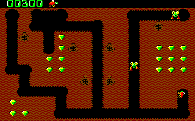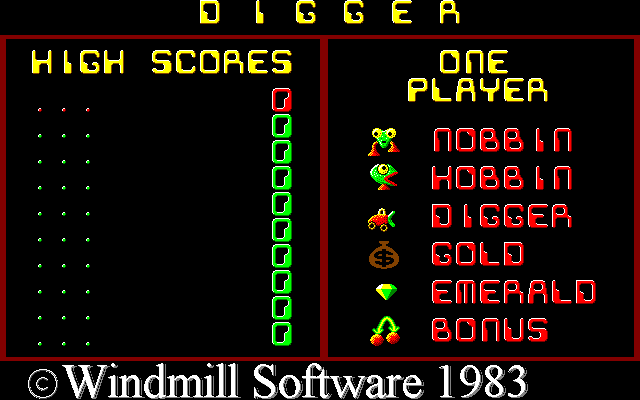 Digger was originally created by Windmill software in 1983 and released as a copy-protected, bootable 5.25” floppy disk for the IBM PC/XT. As it requires a genuine CGA card, it didn’t work on modern PCs. In 1998 a new version was created by Andrew Jenner which runs on all PCs with CGA or better and, whilst retaining all the atmosphere and playability of the original, has many new features.
