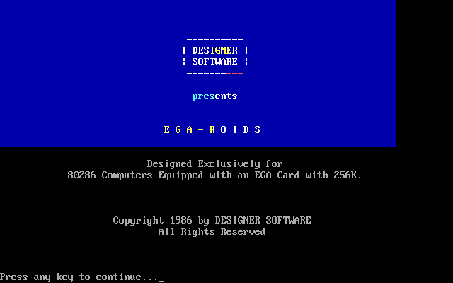 EGA-Roids is a Freeware Shoot 'em up game published by Designer Software in 1986.