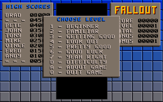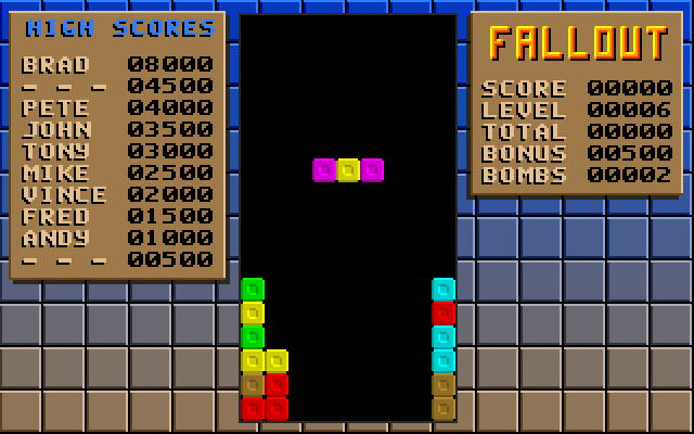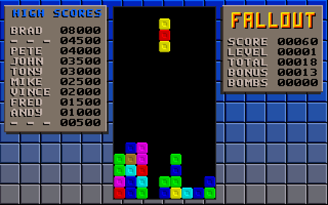 Fallout Brad Taylor, 1991 Play now Bookmark Download Fallout is a Shareware Tetris game published by Brad Taylor in 1991. Category: Tetris License: Shareware Rating: rate now Language: English Share this game Facebook Twitter Reddit Game controls - Move left - Move right - Turn - DropQ - Quit Rating & comments No ratings yet Rate now