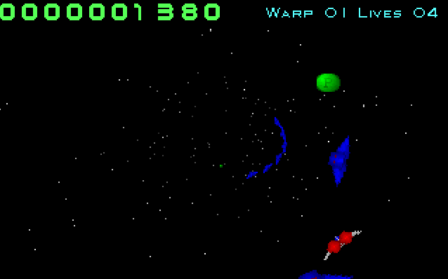In G-Fighter you move around in a full 360-degree circle and shoot inwards towards enemies that fly outwards (and inwards) to group in the center. You cannot collide with enemy ships, however you can collide with: asteroids, enemy bullets (red stars), and shockers (blue electricity).