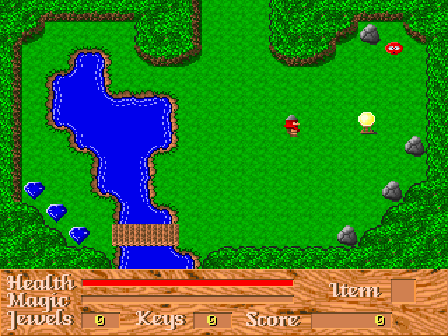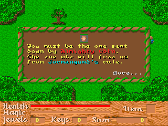 You are Thor, The God of Thunder! Armed with only your enchanted hammer that always returns to the one who throws it, you must journey through dozens of puzzles and fight your way through hundreds of creatures highly motivated to stop you. Along the way you will find several items that you’ll need to complete your adventure. Many items are not what you would expect to find in 927 A.D. You will also encounter villages filled with goofy people who try to help you, but often just make you laugh with their hilarious responses. At the end of each of the three parts, you will come face-to-face with an evil boss character, whom you must defeat to free the villagers from his tyranny!