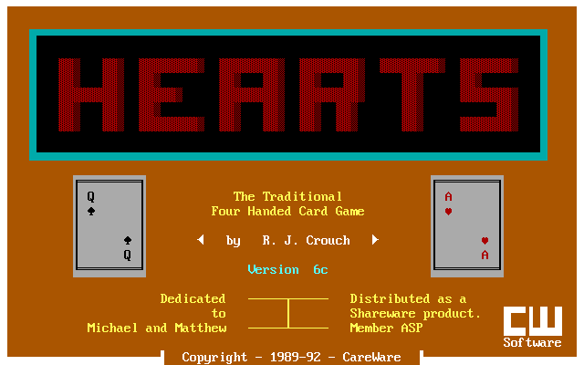Hearts CareWare, 1992 Play now Bookmark Download Hearts is a Shareware Card games game published by CareWare in 1992. Category: Card games License: Shareware Rating: rate now Language: English Share this game Facebook Twitter Reddit Game controls - Move left - Move rightEnter - Select or play card Rating & comments No ratings yet Rate now