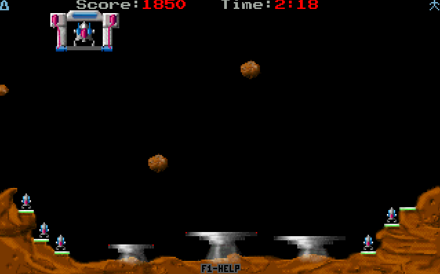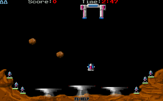 Descend to the surface in a controlled fashion and land on one of the available landing pads. Smaller pads earn more points. You MUST use retro rockets to touch down. Make sure that you are going slow enough that landing gear is extended. Landing gear retracts automatically when you are going too fast to land safely. Astronaut will beam aboard your ship. Fly back up to waiting mothership. On the way up, you may blast away at the meteors to clear your path and earn extra points. Dock precisely with the mothership and then turn around and go get the rest of the astronauts.