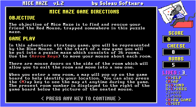 Mice Maze Soleau Software, 1996 Play now Bookmark Download The objective of Mice Maze is to find and rescue your friend the Red Mouse, trapped somewhere in this puzzle maze. Category: Adventure License: Shareware Rating: rate now Language: English Share this game Facebook Twitter Reddit Game controls - Left - Right - Up - Down Rating & comments No ratings yet Rate now