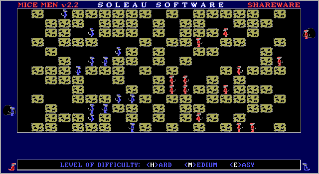 The object of Mice Men is to get all twelve of your color mice to the other end of the game board before your opponent does. In this version you will always be playing the blue mice and the computer will play the red mice.