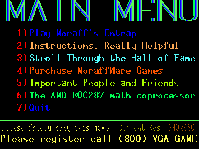 Moraff's Entrap MoraffWare, 1991 Play now Bookmark Download Moraff's Entrap is a Shareware Puzzle game published by MoraffWare in 1991. Category: Puzzle License: Shareware Rating: rate now Language: English Share this game Facebook Twitter Reddit Game controls - Forward - Left - Right - Back Rating & comments No ratings yet Rate now