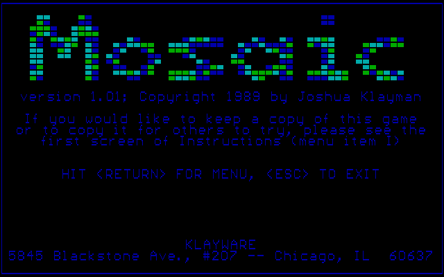 Mosaic Joshua Klayman, 1989 Play now Bookmark Download Mosaic is a Shareware Tetris game published by Joshua Klayman in 1989. Category: Tetris License: Shareware Rating: rate now Language: English Share this game Facebook Twitter Reddit Game controls - Left - Right - Up - DownSpace - Place tiles Rating & comments No ratings yet Rate now