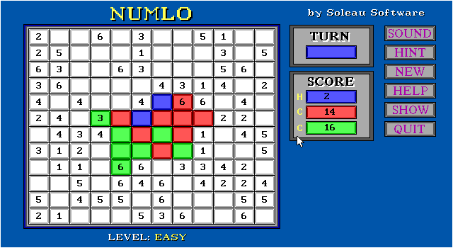 The object of Numlo is to capture squares on the board, so that the square values and the number of captured squares will give you the highest point total at the end of the game. The rules are quite simple, it takes a minute to learn and with practice you’ll see yourself improving steadily.