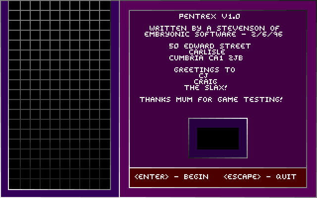 Pentrex Embryonic Software, 1996 Play now Bookmark Download Pentrex is a Freeware Tetris game published by Embryonic Software in 1996. Category: Tetris License: Freeware Rating: rate now Language: English Share this game Facebook Twitter Reddit Game controls - Left - Right - Rotate - Down Rating & comments No ratings yet Rate now