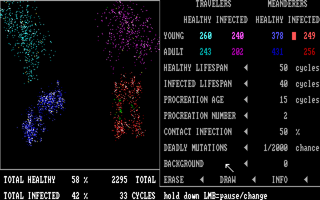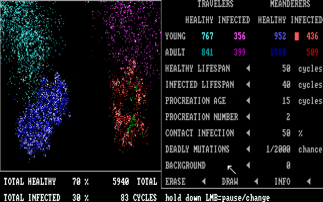Plague was programmed by John Shramko for use in an introductory Microbiology class. You will use your mouse to spray colonies of creatures, each color coded for different genetic traits, onto a pre-made or custom designed field. Watch the dynamic interaction of growth, travel, birth, and death. Unleash clouds of infection which will spread or perish, depending on the conditions you choose.