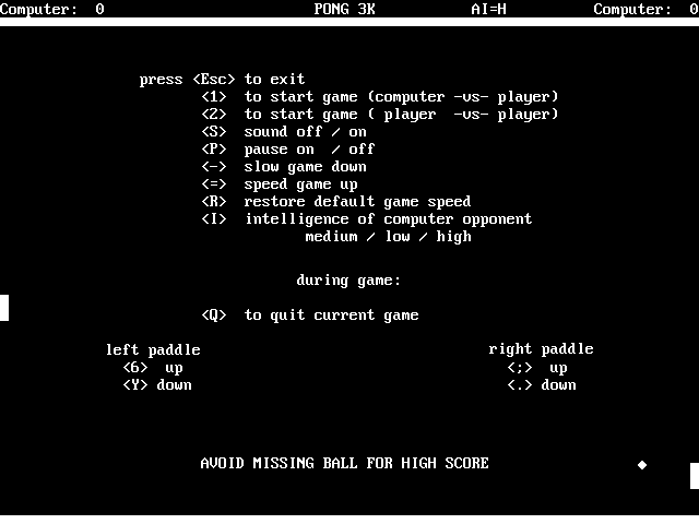 PONG3K dtuttle25, 1999 Play now Bookmark Download PONG3K is a Freeware Classic game published by dtuttle25 in 1999. Category: Classic License: Freeware Rating: rate now Language: English Share this game Facebook Twitter Reddit Game controls Left player:6 - UpY - DownRight player:; - Up. - Down Rating & comments No ratings yet Rate now