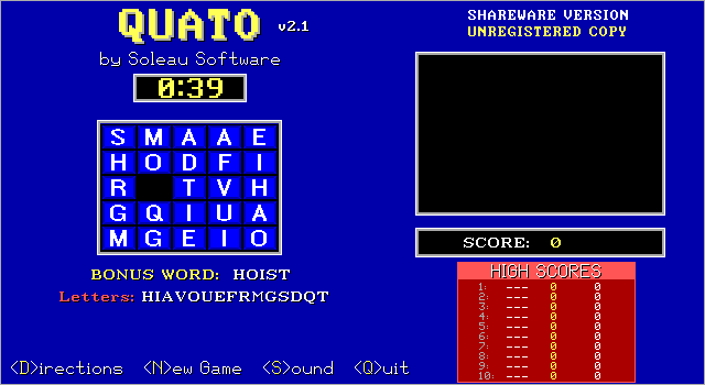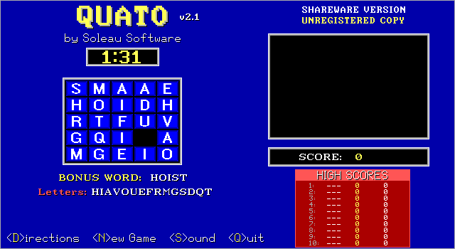 The object of Quato is quite simple. On the 5x5 game grid there are 24 letters randomly placed at the beginning of each game. The objective is to move the letter tiles around to spell as many four or five letter words as you can within 3:00 minutes.
