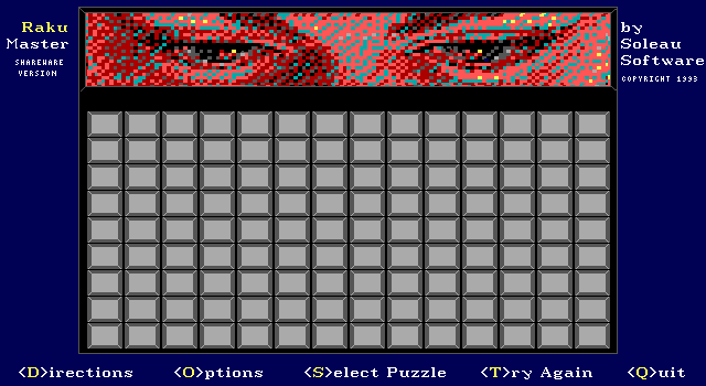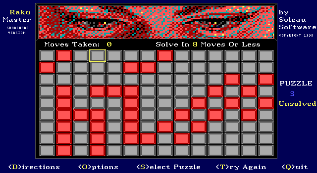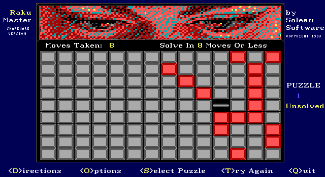 The objective of Raku Master is to flip all the tiles on the game board back to the color gray in as few moves as possible.