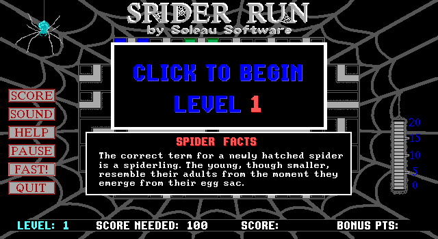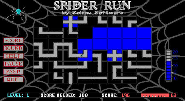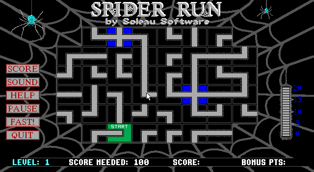 The objective of Spider Run is to keep the spider running across his web for as long as possible before it reaches a dead end.