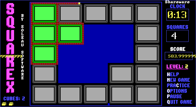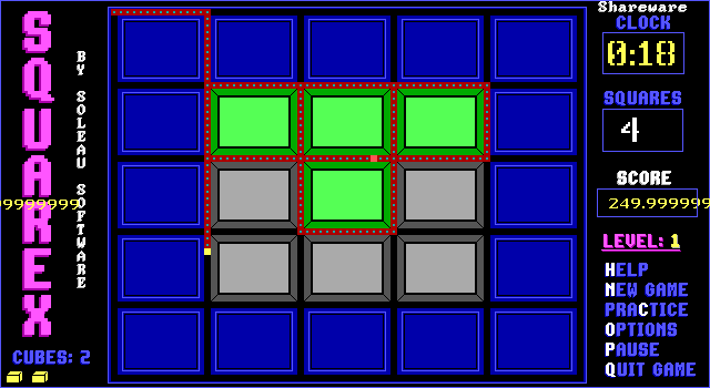 The objective of Squarex is to capture all the gray squares on the game board by maneuvering your yellow cube around each one. When the game begins, your yellow cube will be blinking in the upper left hand corner of the board. At the bottom right side of the board, there are orange cubes trying to catch you as you move around the puzzle.