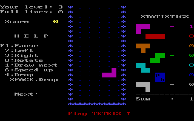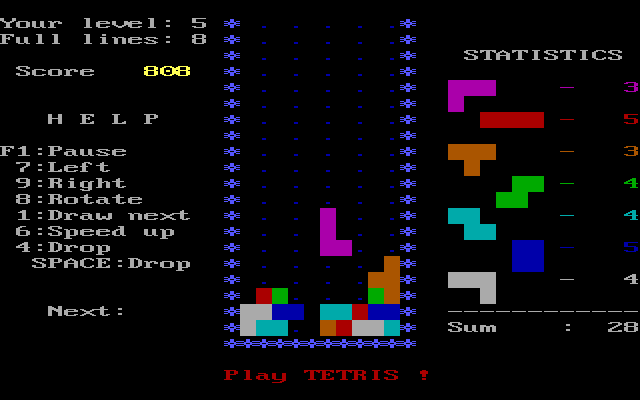 This is a DOS port of the original Tetris game. Read the story behind Tetris at Vadim Gerasimov’s website.
