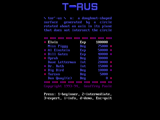 Torus Geoff Poole, 1994 Bookmark Download Torus is a Shareware Puzzle game published by Geoff Poole in 1994. Category: Puzzle License: Shareware Rating: rate now Language: English Share this game Facebook Twitter Reddit Game controls - Move left - Move right - Get disc - Put disc Rating & comments No ratings yet Rate now