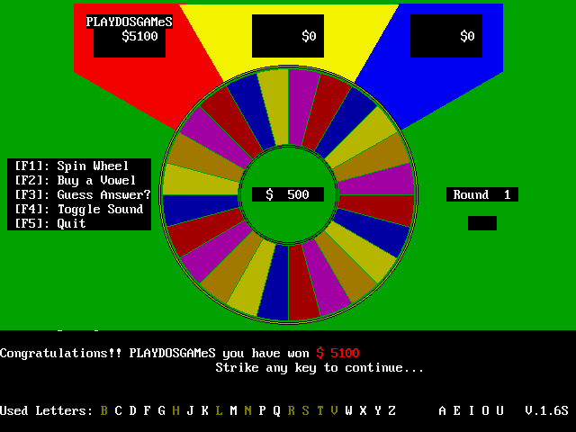 VGA Wheel Russell Mueller, 1991 Bookmark Download VGA Wheel is a Shareware Puzzle game published by Russell Mueller in 1991. Category: Puzzle License: Shareware Rating: rate now Language: English Share this game Facebook Twitter Reddit Game controls F1 - Spin wheelF2 - Buy a vowelF3 - Guess answerF4 - Toggle soundF5 - Quit Rating & comments No ratings yet Rate now