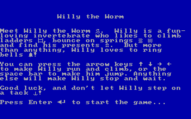 Willy the Worm Alan Farmer, 1985 Play now Bookmark Download Willy the Worm is a Shareware Platform game published by Alan Farmer in 1985. Category: Platform License: Shareware Rating: rate now Language: English Share this game Facebook Twitter Reddit Game controls - Move left - Move right - Move up - Move downSpace - Jump Rating & comments No ratings yet Rate now